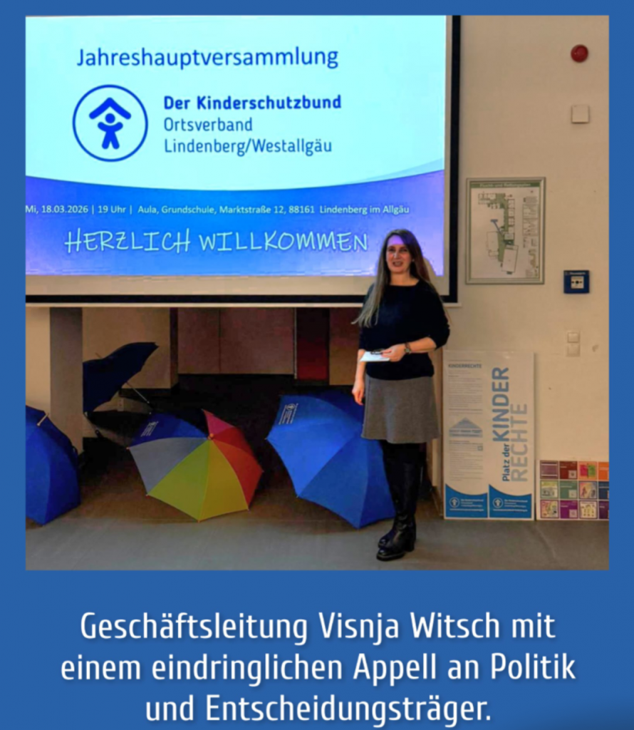 Der Kinderschutzbund Lindenberg/Westallgäu ist ein Ort der Unterstützung und eine starke Stimme für Kinder. Eine Stimme, die daran erinnert, dass jede Entscheidung von Erwachsenen Auswirkungen hat. Und dass es unsere gemeinsame Verantwortung ist, Kindern eine Zukunft zu ermöglichen, in der sie sicher, gerecht und mit Würde aufwachsen können.