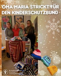 Auch in diesem Jahr hat uns Oma Maria Maier (88) wieder eine ganz besondere Spende übergeben. Nachdem sie im letzten Jahr bereits über 200 handgestrickte Mützen und liebevoll gehäkelte Decken ihrer Freundin Helgard gespendet hatte, hat sie erneut Großartiges geschaffen: