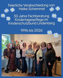 Am 1. April 2026 wurde Heike Schemmel im Rahmen einer liebevoll gestalteten Abschiedsfeier aus ihrem beruflichen Weg in der Fachberatung Kindertagespflege verabschiedet. Gemeinsam mit dem Team, langjährigen Wegbegleiterinnen und ihrer Familie blickte sie auf 30 Jahre engagierte Arbeit zurück, auf eine Zeit, in der sie die Kindertagespflege in Lindenberg entscheidend mit aufgebaut und geprägt hat.